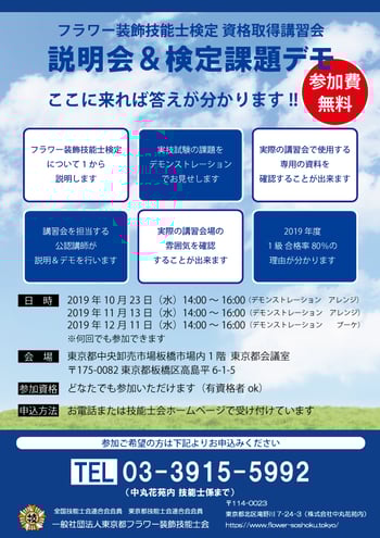 しかも、今回は【説明会&検定課題デモンストレーション】ということで、当技能士会の公認講師がフラワー装飾技能士検定についての説明と同時にデモンストレーションとして実技試験の課題を皆様の目の前で実演製作いたします。