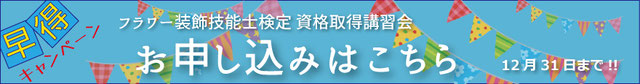 東京都フラワー装飾技能士会 第2期資格取得講習会では、2017年12月31日までにお申し込み頂いた方には、特別に【早得キャンペーン】をご用意いたしました。